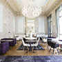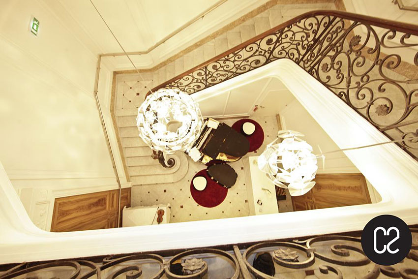 The grand lounges, between pastries and a large fireplace topped with a mirror, have become a bar and a lounge. The monumental marble staircase, highlighted by a bronze railing and twelve chandeliers by Paolo Rizzatto, leads to the house's upper floors.