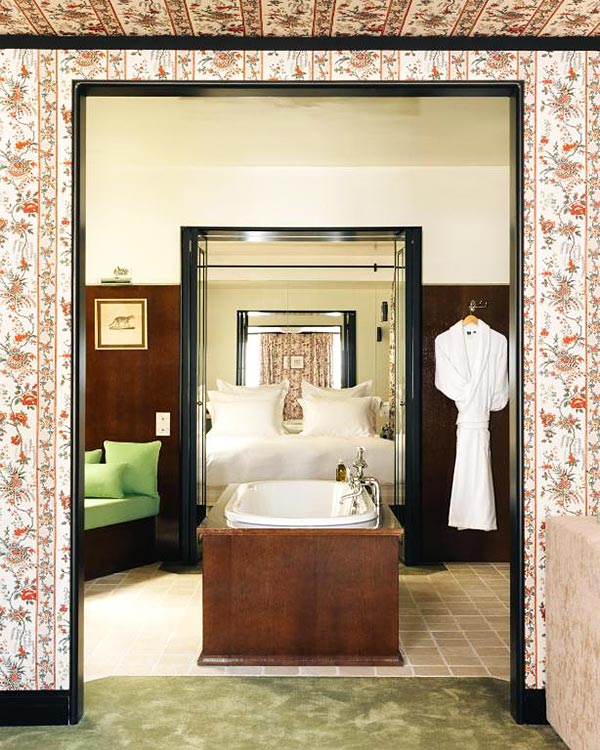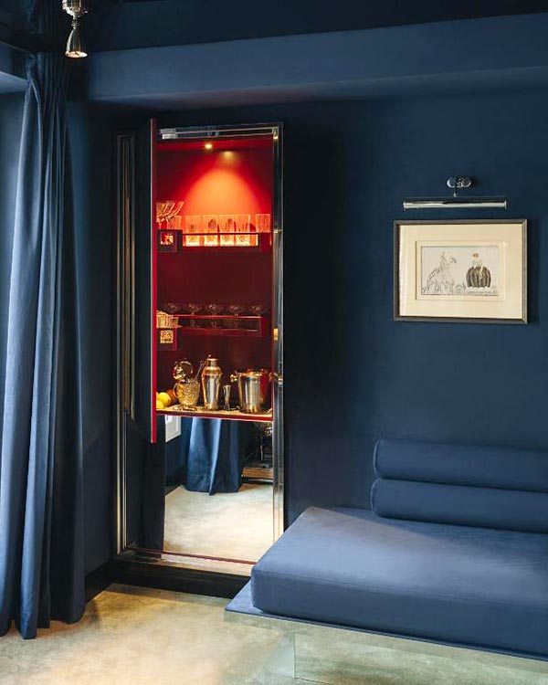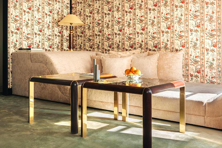 In Suite No. 1, caramel hues and rosewood furniture evoke a 70s-style living room reimagined with humor. A winter garden under palm trees extends the space, inviting you to enjoy a homemade breakfast or a cocktail prepared at the suede-covered bar. In Suite No. 2, the stunning floral tapestry from the Pierre Frey archives, patiently hand-stretched by upholsterer Clémentine Messié, envelops the walls and ceiling in a vibrant decor. At the center, a bathtub stands like a sculpture, between varnished wood and midnight blue velvet.