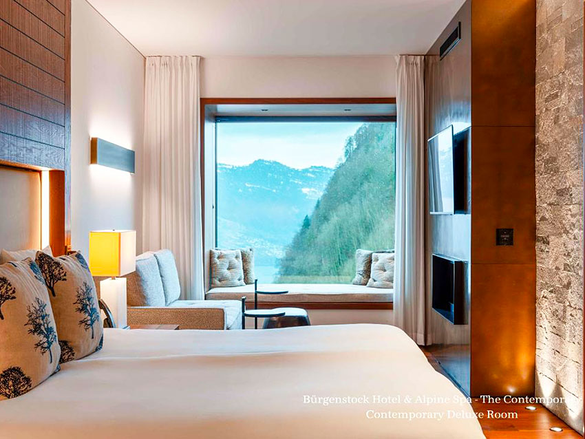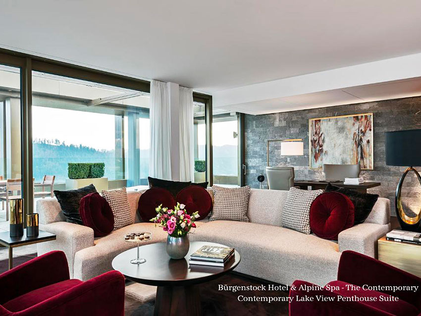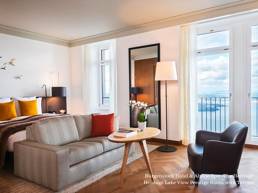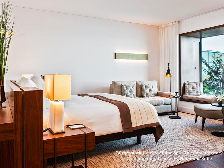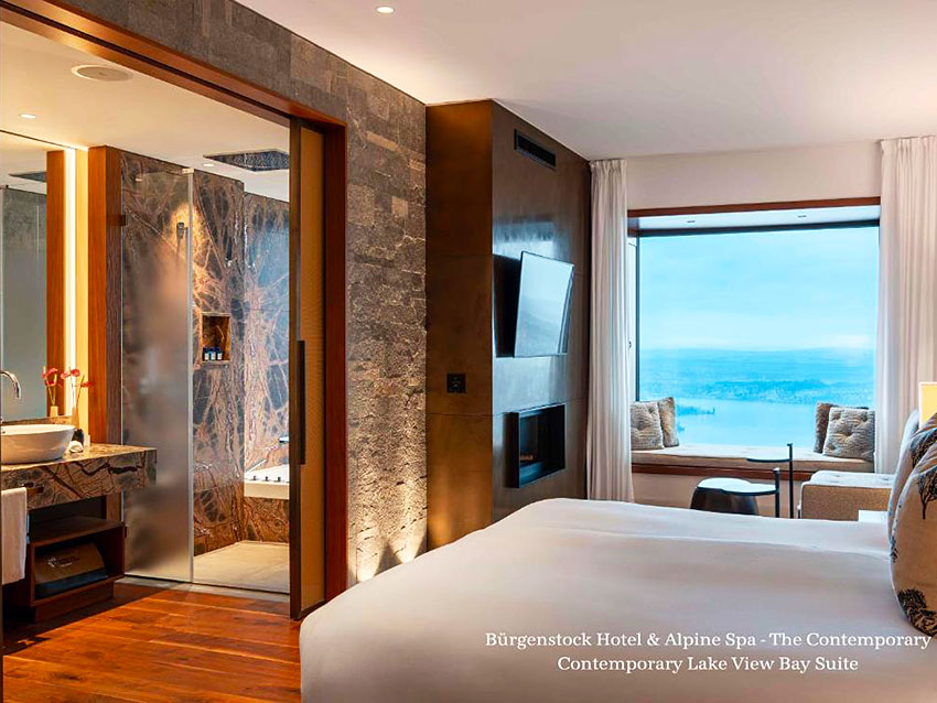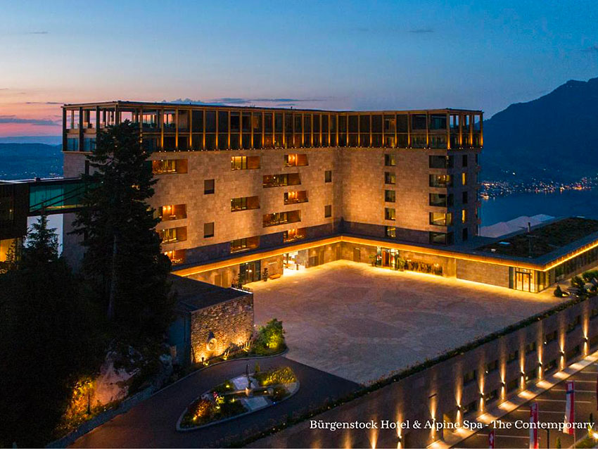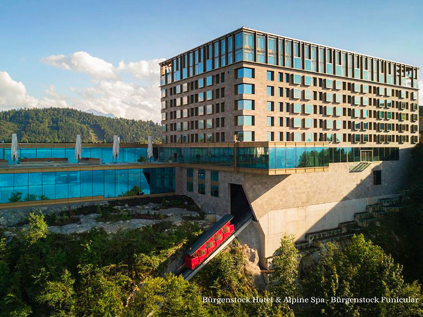 Alojándote en el Bürgenstock Hotel & Alpine Spa, accedes a más que un hotel excepcional: un vasto complejo sin coches, un spa de 10,000 metros cuadrados, 12 restaurantes (cocinas francesa, asiática, libanesa, italiana, suiza), bares y salones, numerosas boutiques, 3 canchas de tenis y un campo de golf de 9 hoyos.