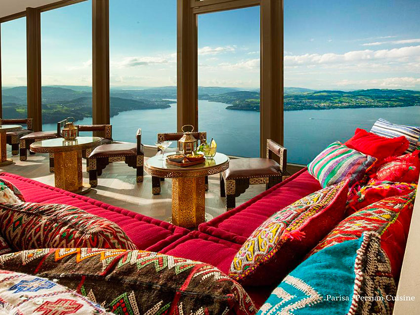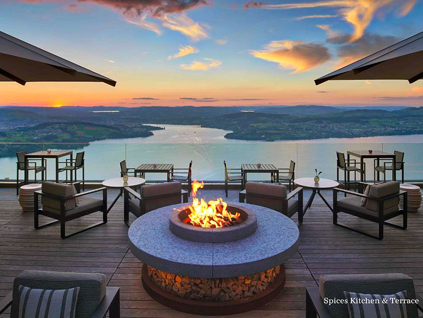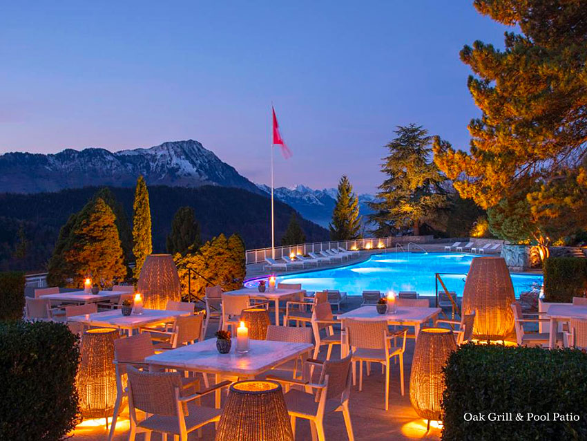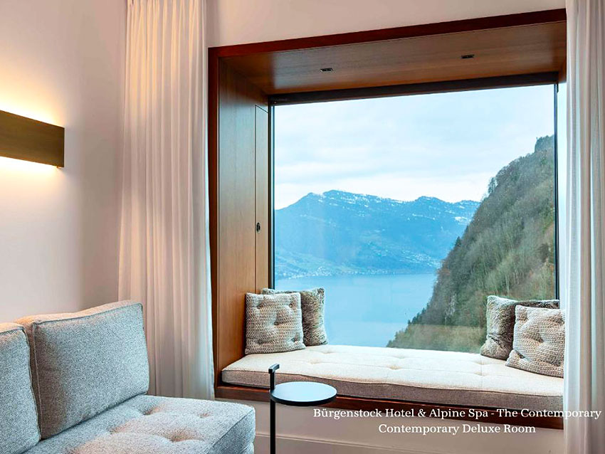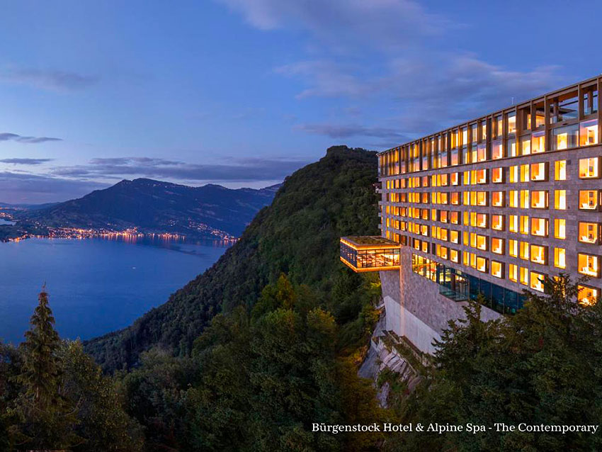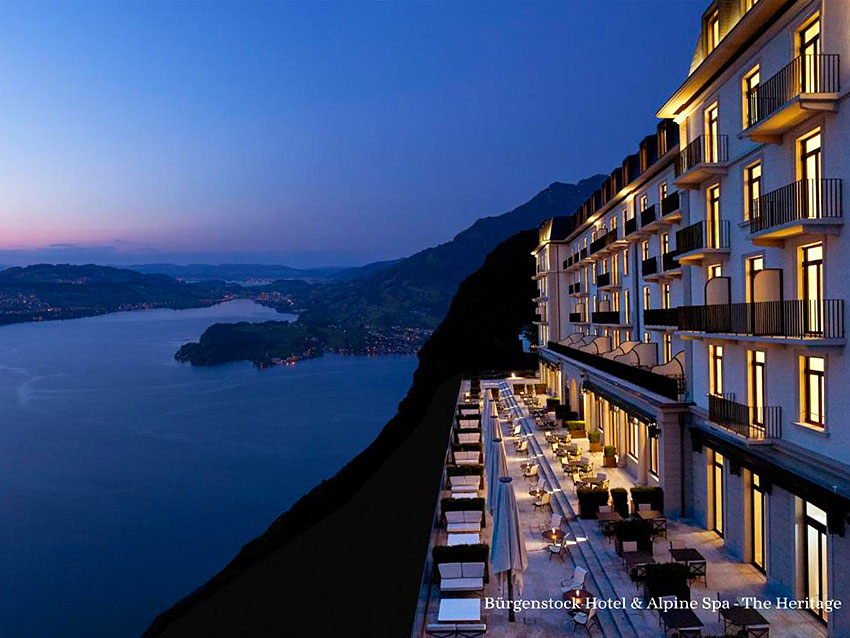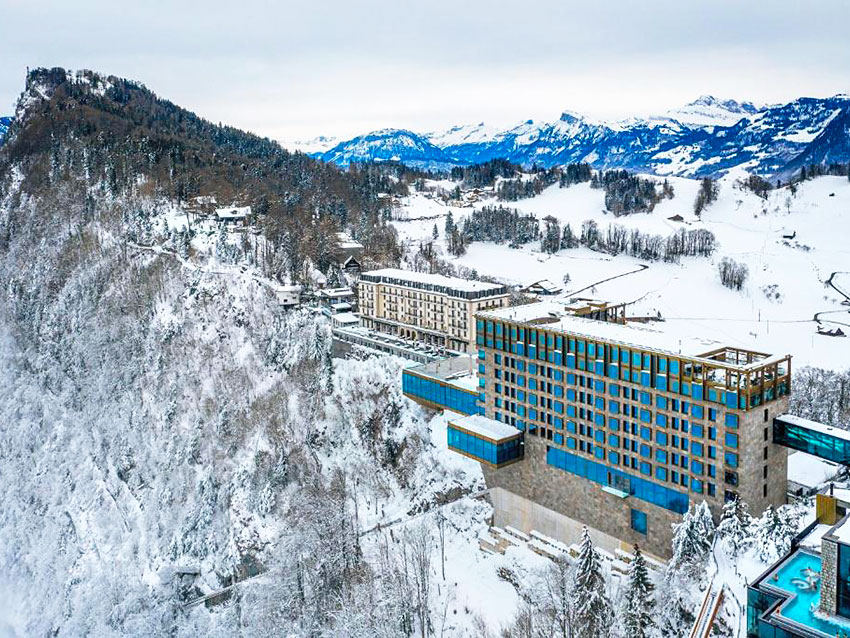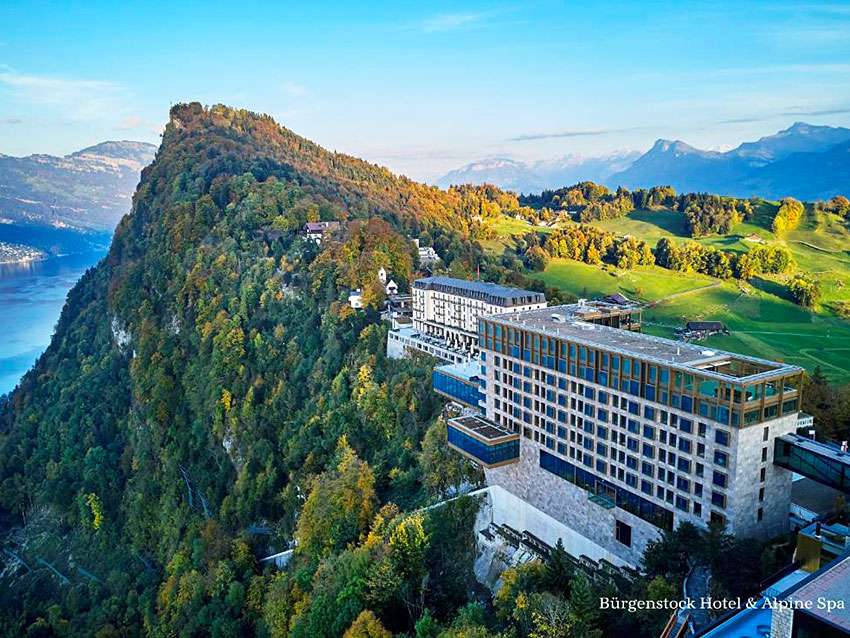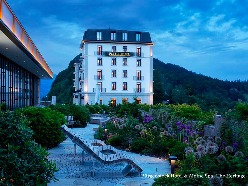 Durante más de ciento cincuenta años, esta dirección en el centro de Suiza ha atraído las miradas discretas de la historia, íconos del cine, diplomáticos y viajeros en busca de una tranquilidad esplendorosa. Llegar allí no es algo trivial: un paseo en barco por el lago de los Cuatro Cantones, un funicular centenario que asciende por la ladera de la montaña, y te trasladas a un mundo aparte, encaramado en una espectacular cresta rocosa, 500 metros por encima del lago de los Cuatro Cantones.