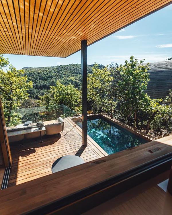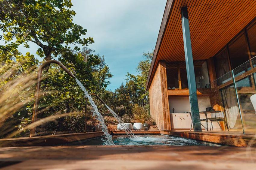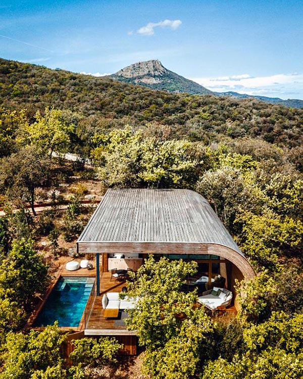 Desde 2021, los lodges de Souki Lodges & Spa invitan a disfrutar de un retiro en las afueras del pueblo de Cabrières. En estos luminosos paisajes del Hérault, Fabien Morcel y Gilles Pascal han diseñado dos refugios contemporáneos inmersos en la naturaleza. Diseñados para dos personas, cultivan el arte del paréntesis, entre líneas puras, vistas infinitas y una atmósfera serena.