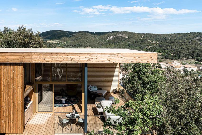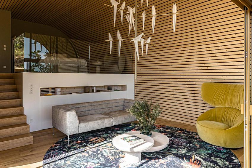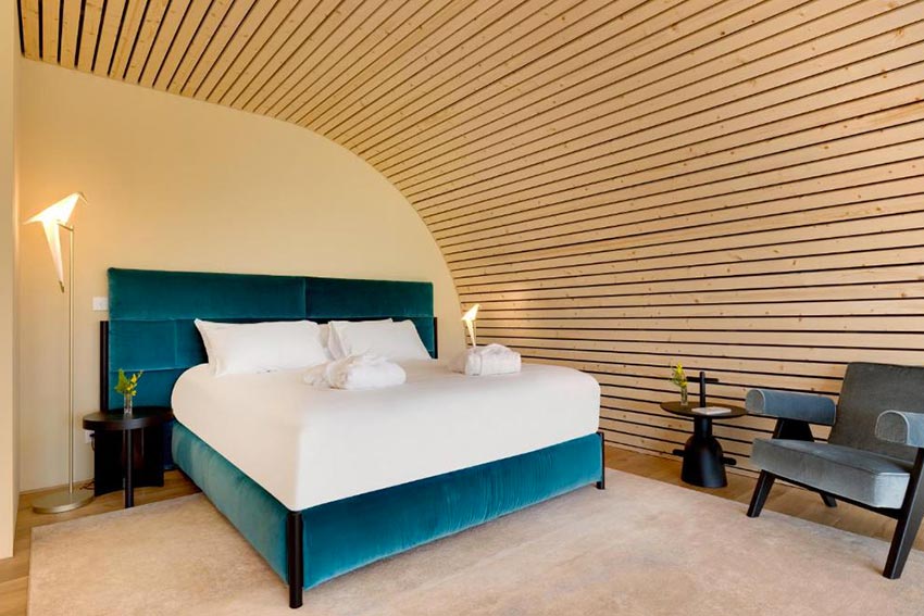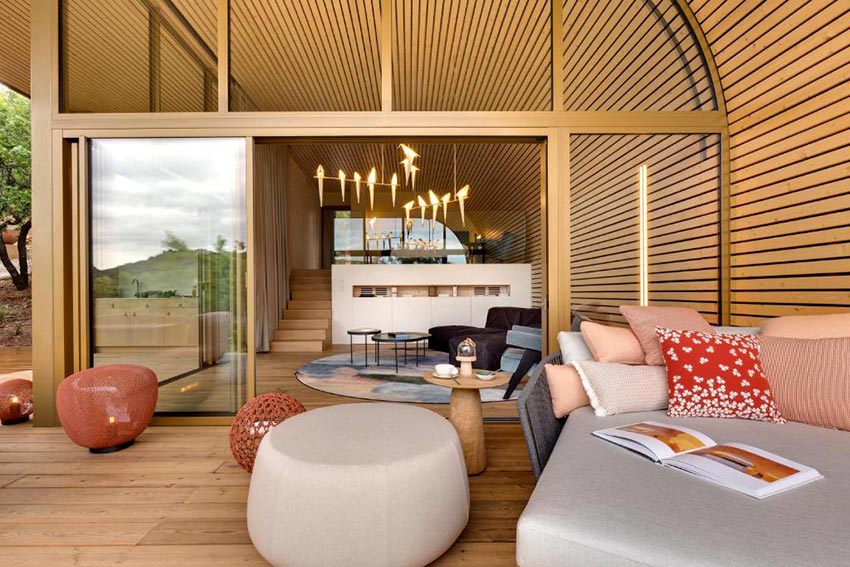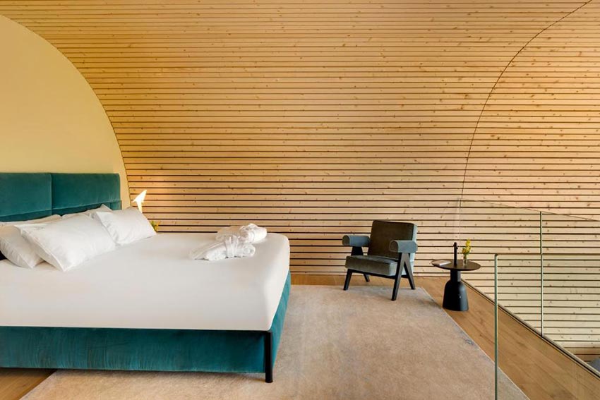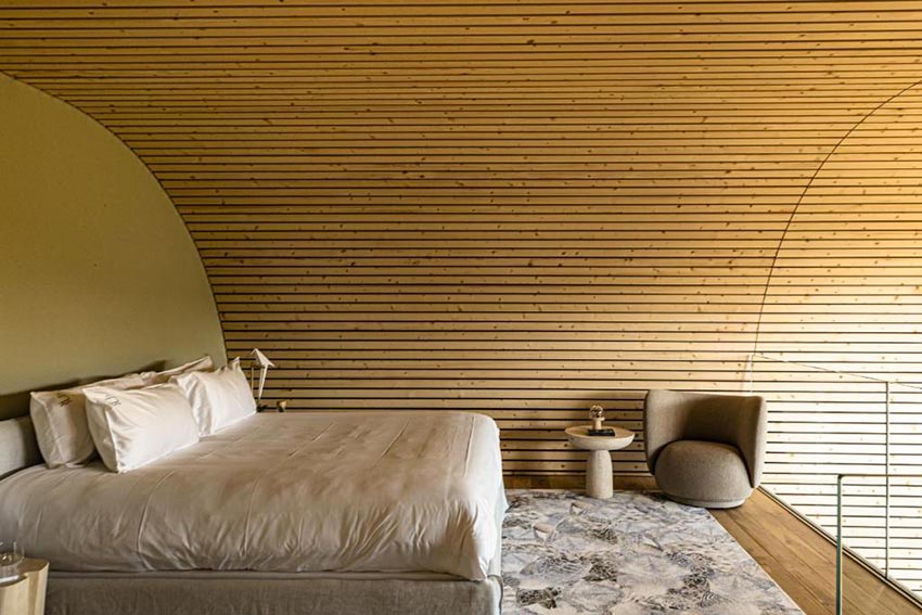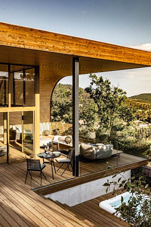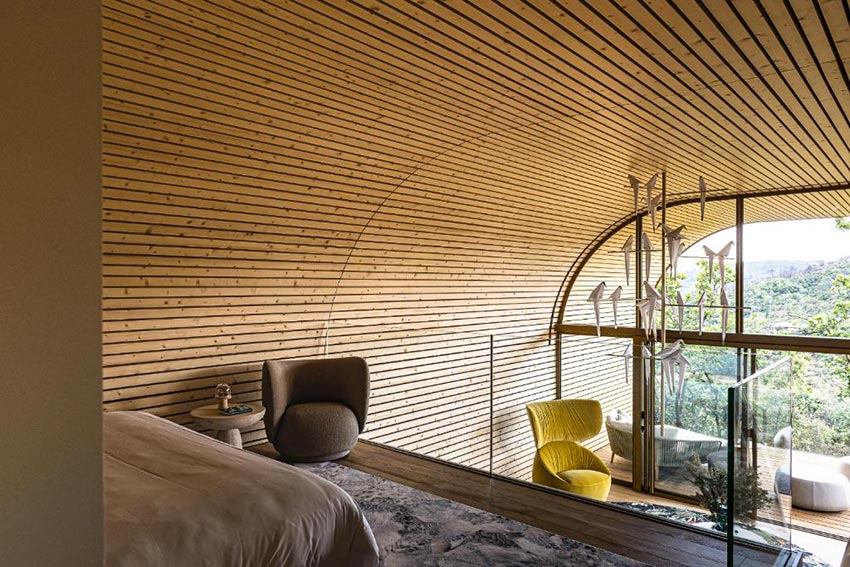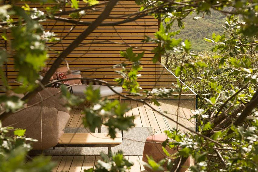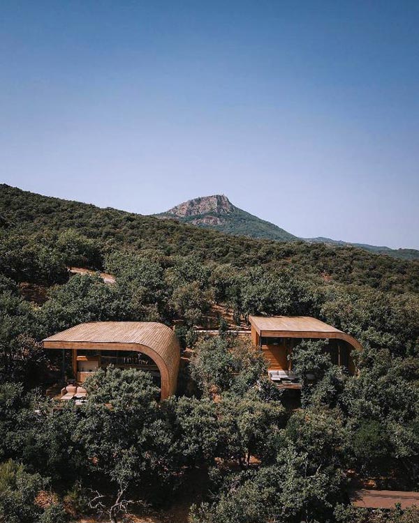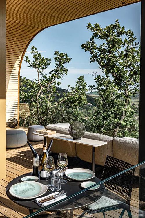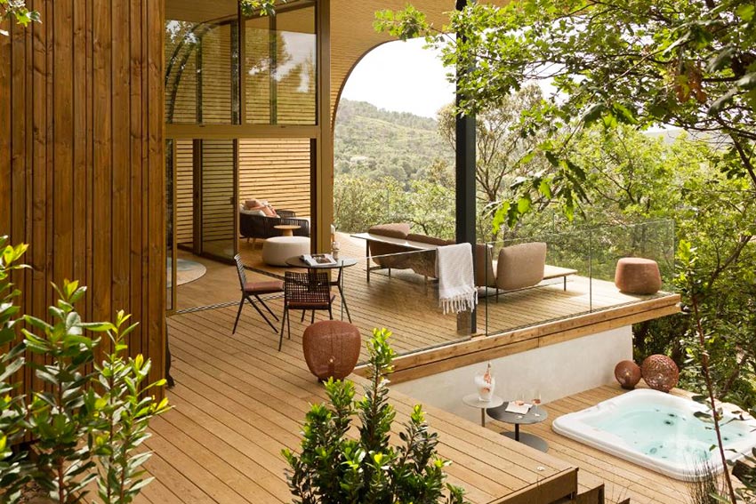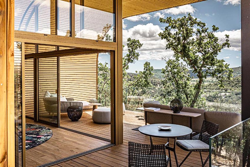 Al llegar a su lodge por un sendero bordeado de robles centenarios, se descubre una arquitectura que parece haber crecido con el paisaje. L’Arbre Perché y Le Nuage se despliegan sobre pilotes, orientados al sur para captar la luz desde la mañana hasta la noche. Cada volumen se adapta al relieve sin dominarlo nunca, permitiendo que la naturaleza entre por grandes ventanales que se abren hacia los viñedos y montañas circundantes.