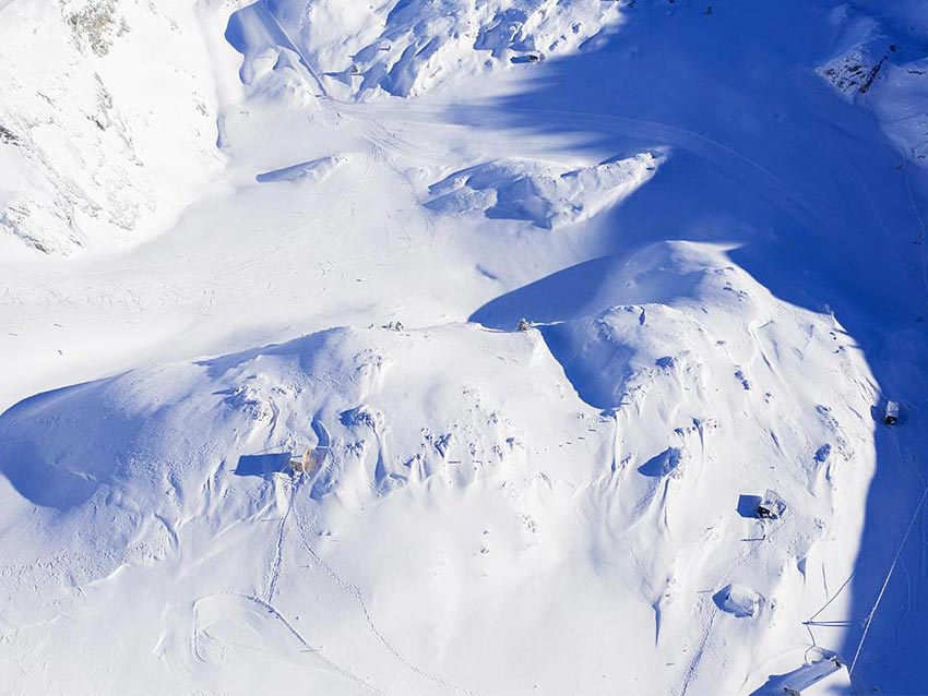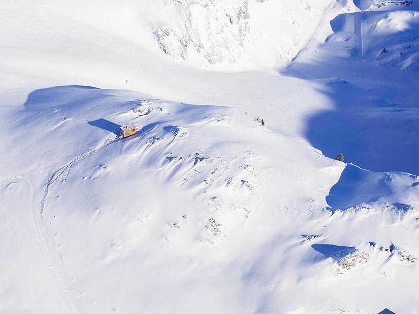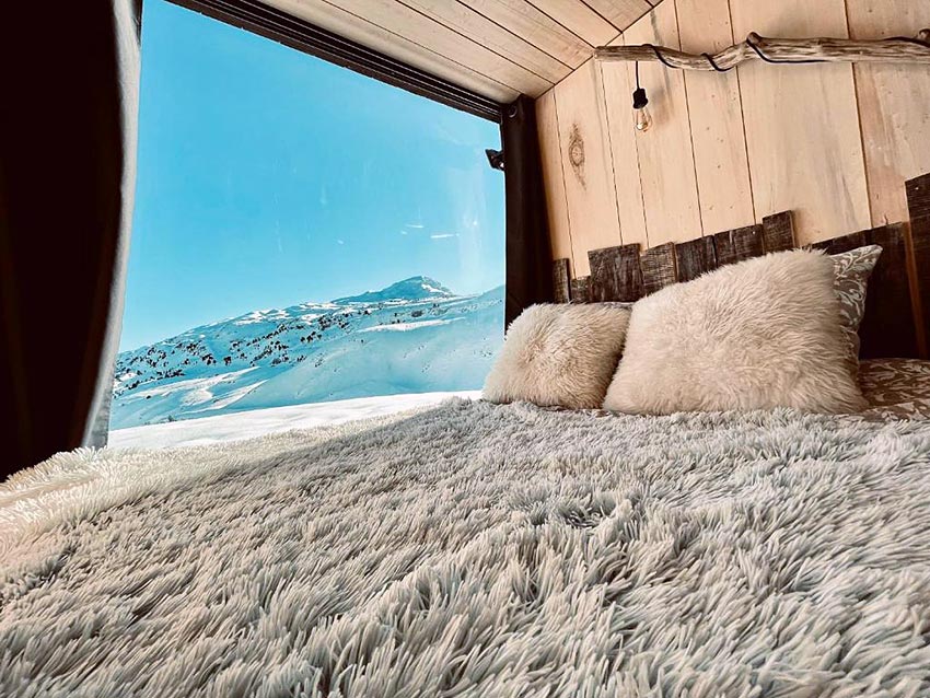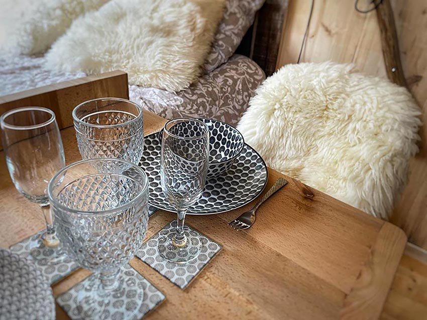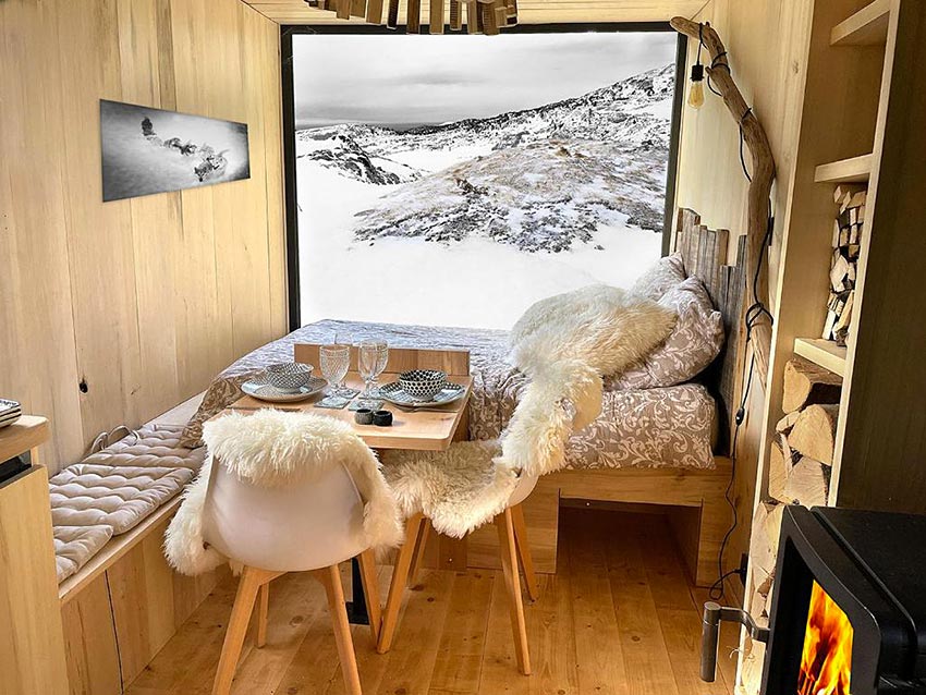 Dietro la vetrata, le cime mostrano tutta la loro candida bellezza. All'interno, tutto è pensato per rallentare. Un letto accogliente di fronte alla montagna, una stufa a legna, pochi oggetti scelti con cura, un'atmosfera ovattata. Ti accomodi, un bicchiere di champagne in mano. Qui niente Wi-Fi, niente schermi. Solo una luce soffusa, una coperta, un libro e il soffio del vento contro le pareti.
