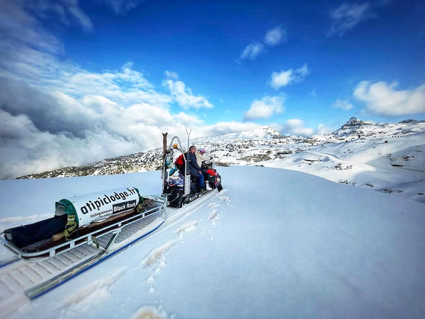 - Salita con motoslitta o con ciaspole (a seconda delle condizioni) e rientro dalle 10:00 con ciaspole in autonomia