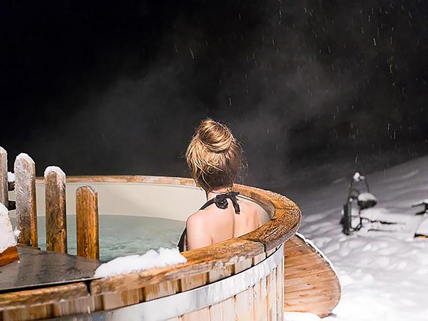 Come opzione, una passeggiata con le ciaspole al calar della sera prolunga il cambiamento d'aria. Ma il punto forte del soggiorno è il bagno nordico. Immerso in acqua a 36°, guardi la neve cadere mentre il legno scoppietta. A pochi metri, il tuo lodge ti aspetta, ancora tiepido, ancora profumato di legno riscaldato.