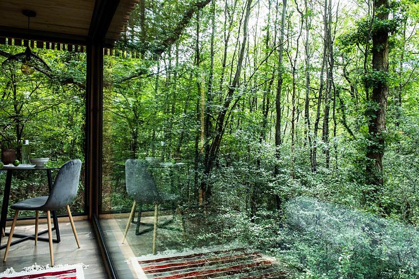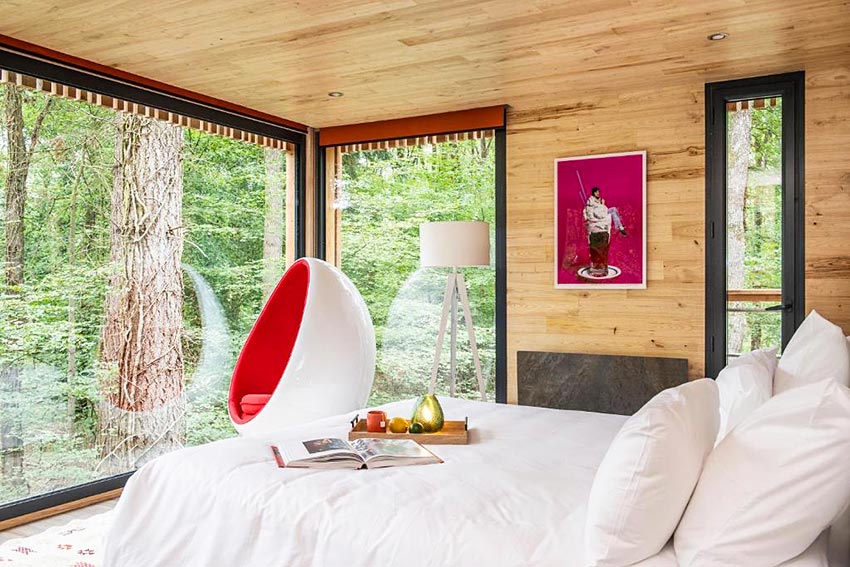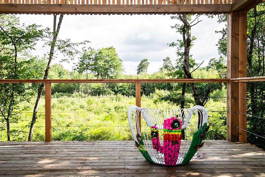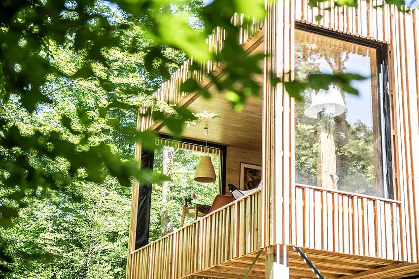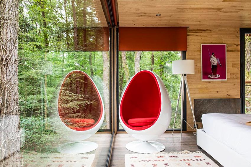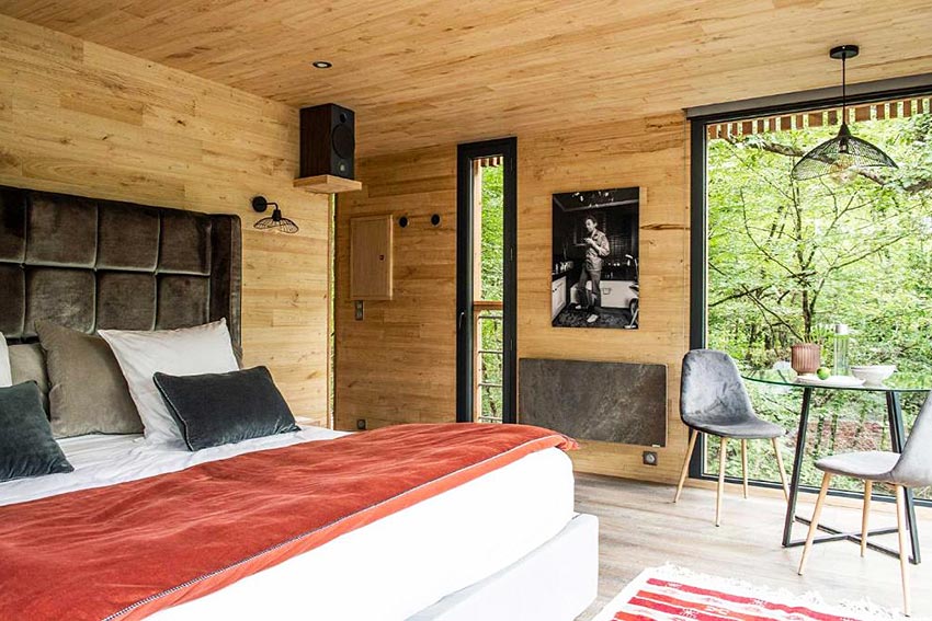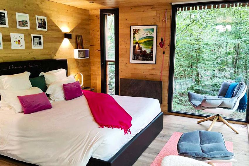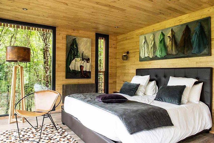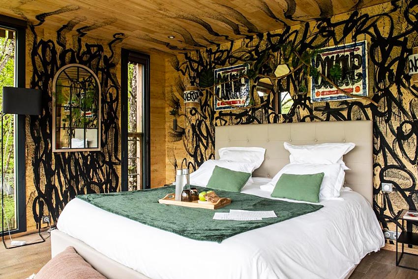 Chaque lodge, perché à quatre mètres du sol, a été confié à un artiste (JonOne, CharlElie Couture, Aurèle…). Résultat : des univers ultra-personnels, immersifs, et une déco qui flirte entre design pointu et minimalisme chaleureux. Bois brut, baies vitrées XXL, œuvres originales, ambiance douce et feutrée. Et surtout : terrasse privée avec jacuzzi, parfois même sauna, face à la forêt. Aucun vis-à-vis, aucun bruit. Juste les arbres, la lumière et toi.